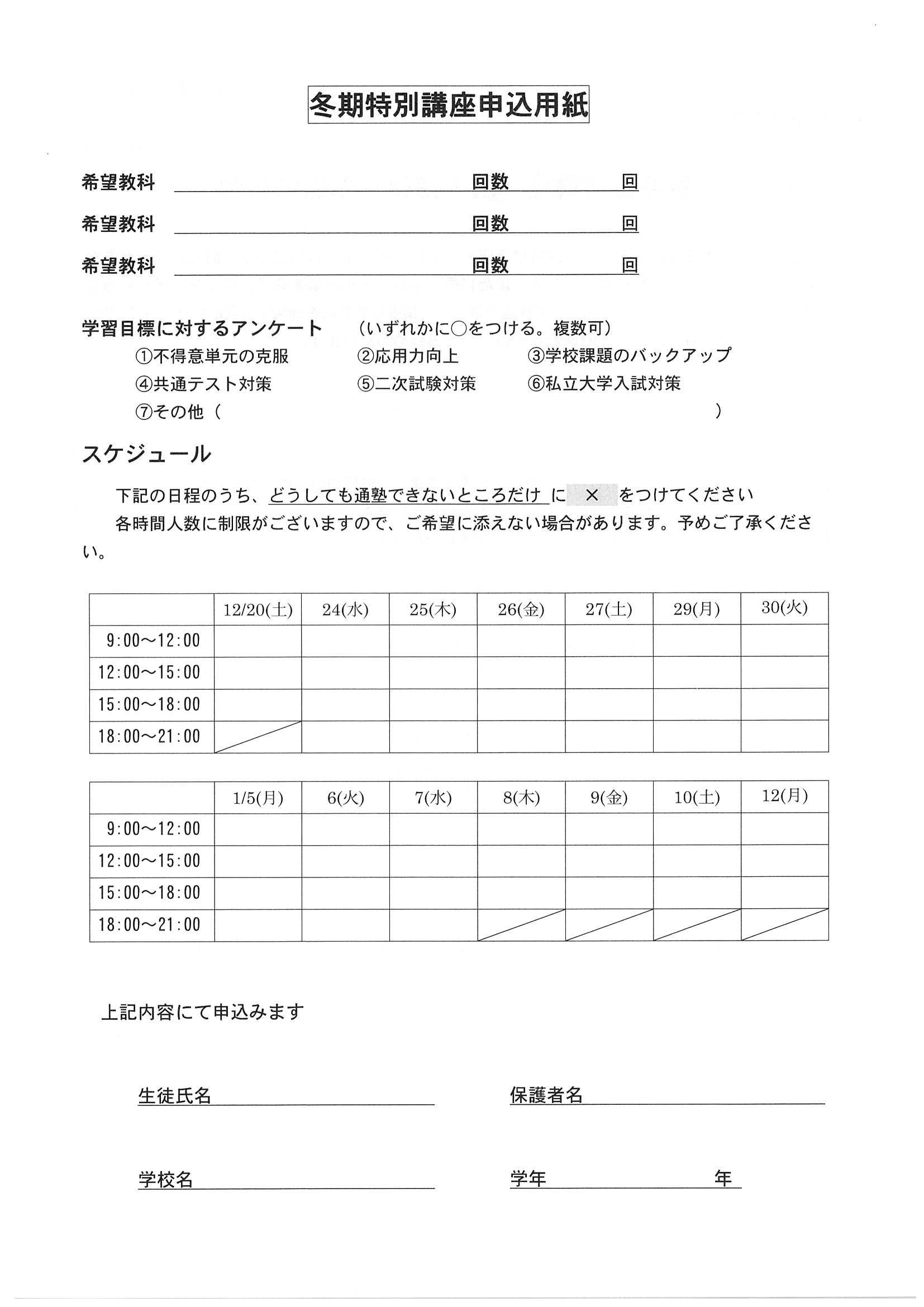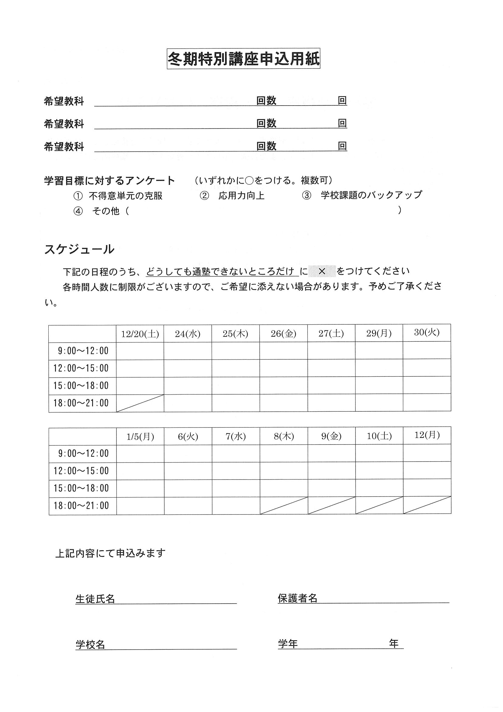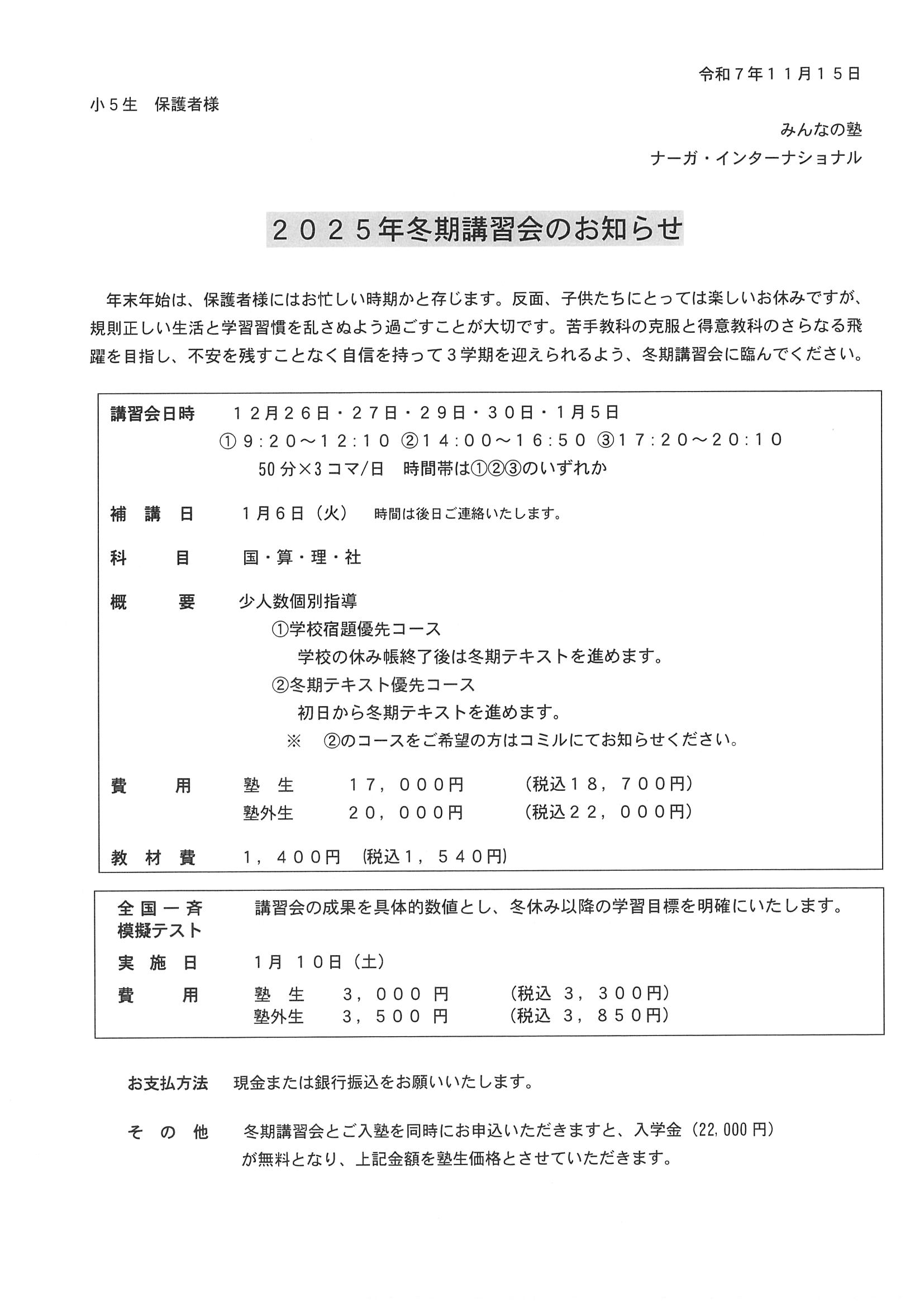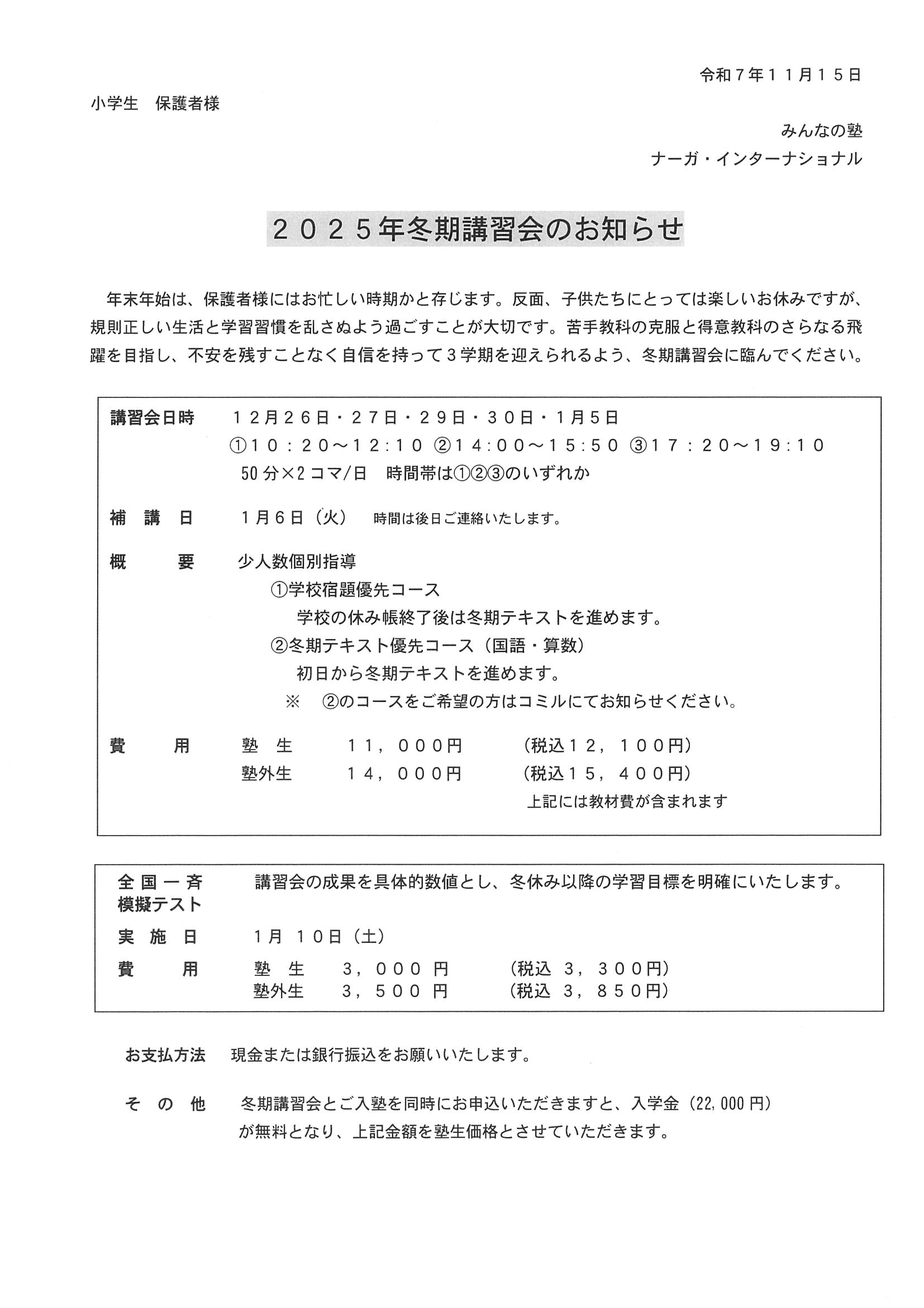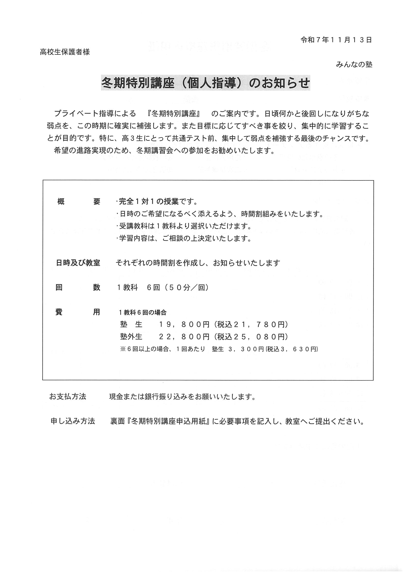 規則正しい生活と学習習慣を乱さず、有意義に過ごせるよう、是非みんなの塾の冬期講習会にご参加ください。