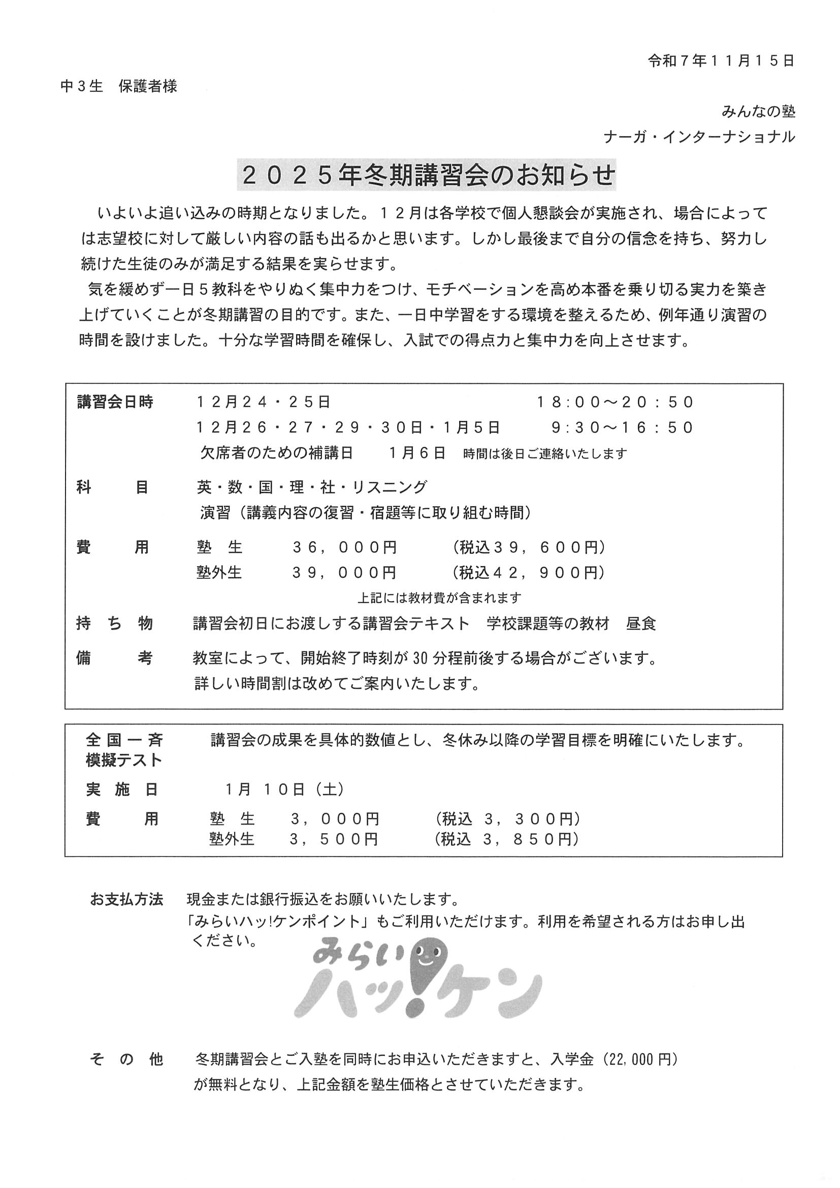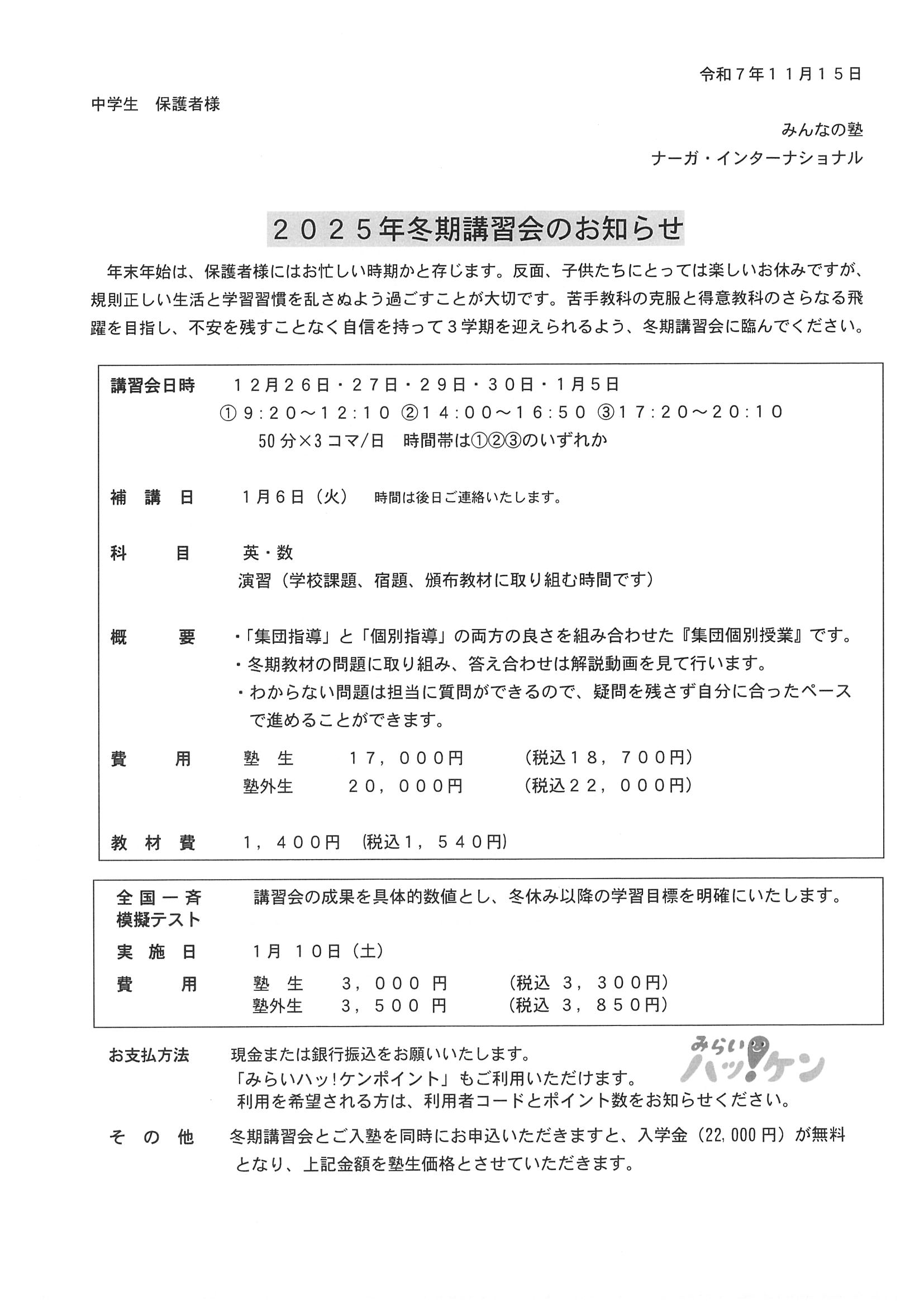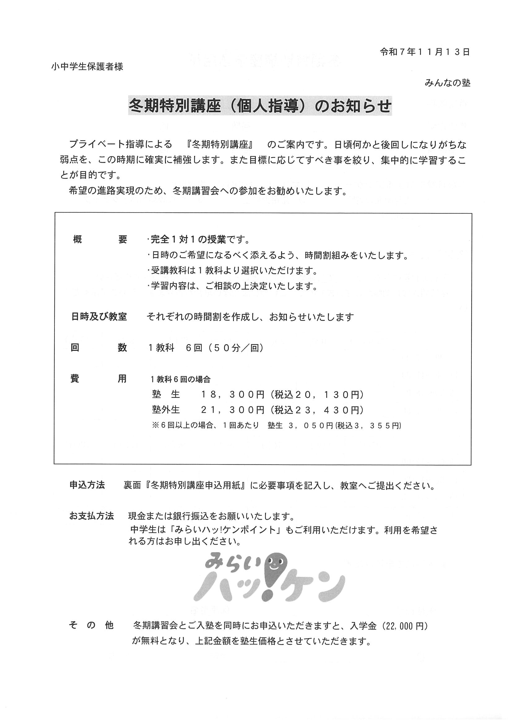 なお、中学生は冬期講習会費用として、「みらいハッ!ケンポイント」をご利用いただけます。