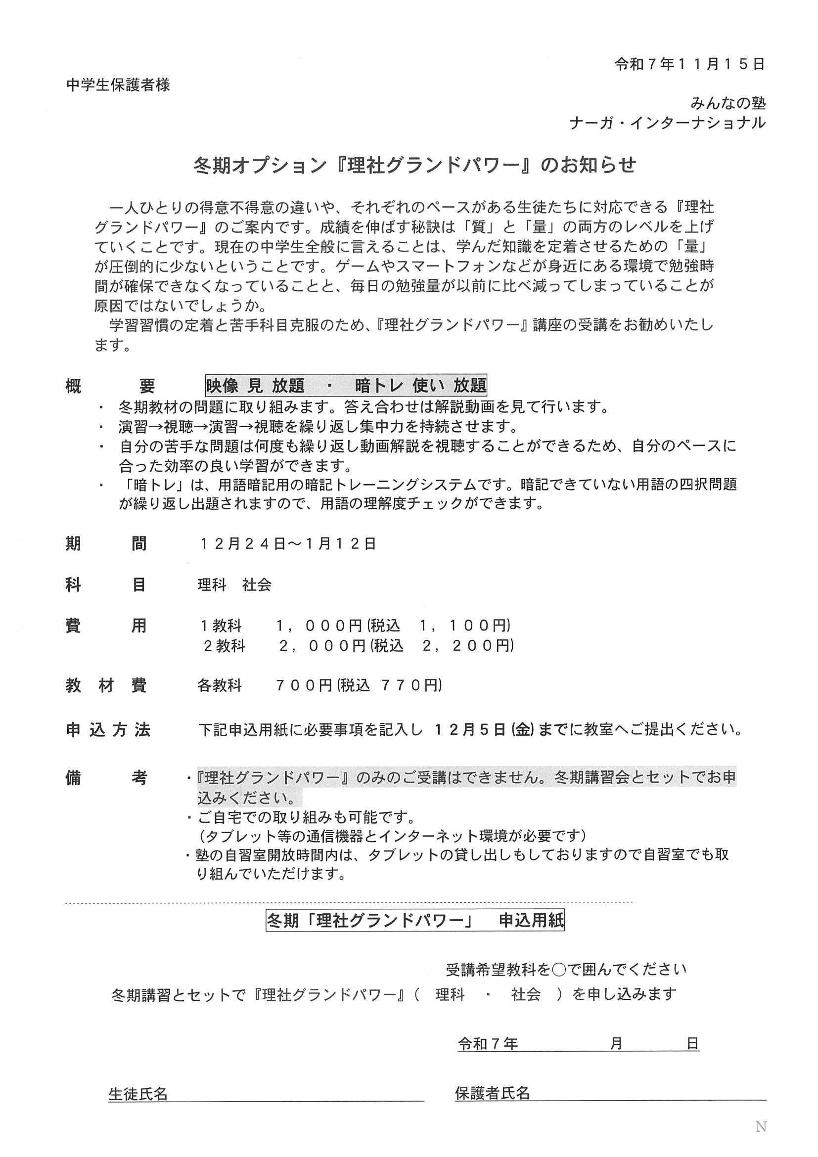 ※理社グランドパワーのみでの受講はできません。冬期講習会(グループ講習または冬期特別講座)とセットでお申込みください。